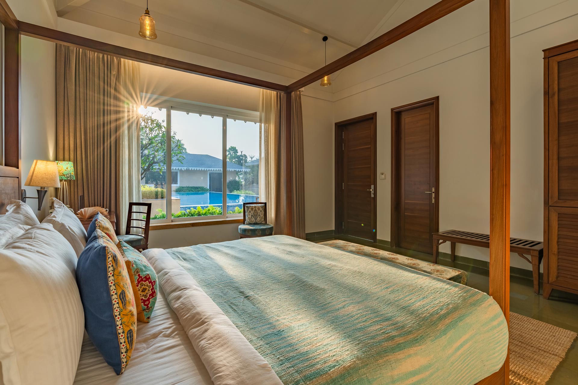 Located between Alibaug and Roha is a beautiful bungalow in Alibaug with a large open deck, artsy interiors and curated experiences. Amara Villa in Alibaug offers a luxurious staycation tucked away from other common tourist areas. A large pool, ample social seating areas, modern rooms, high vaulted ceilings, spacious lawns with outdoor dining setups, you can have a truly memorable time here. This pet-friendly villa in Alibaug offers abundant spaces for your furry friends to run around, play and enjoy in the scenic property. Why Rent This 6BHK Pet-friendly Villa in Alibaug 1) All bedrooms on the ground level with personal keycard access, assuring privacy; 4 out of 6 bedrooms have a balcony 2) Bedrooms also have a workstation, ideal villa for workation in Alibaug 3) Private pool with sun loungers, open deck and a dedicated children’s pool 4) An indoor games room with chess, carrom and pool table 5) A special bonfire fit with comfortable seating around for cozy evenings
