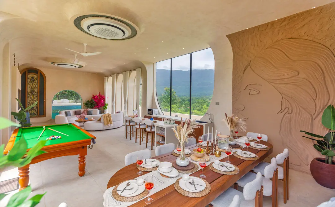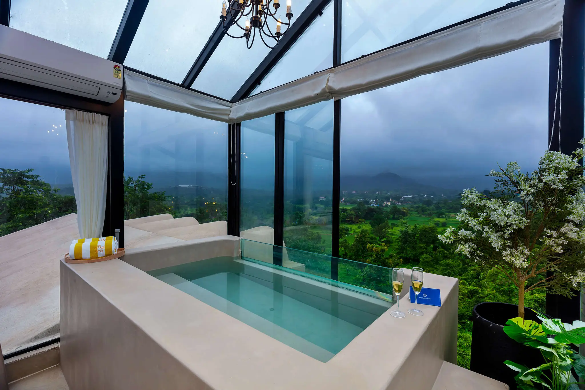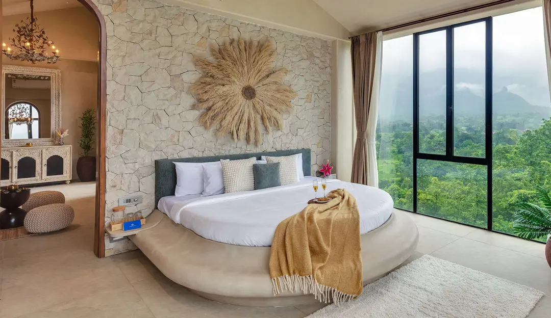 Get all the feels of a living into the Roman era with a getaway at this unique luxury villa near Mumbai. Called the Roman Holiday, this is a 5-bedroom pool villa boasting Pinterest-inspired decor, arched doorways and windows, jacuzzi and bathtubs, an exclusive glasshouse on terrace, and an infinity pool with a backdrop of misty hills. It is one of the best luxury villas near Mumbai that makes you feel you're not just out of the city, but within a different country for a while. From the interiors, the vibe to the Mediterranean meals, this holiday home in Karjat offers an experience in naturally blessed settings. Why Rent This 5BHK European Villa in Karjat 1) A unique architecture inspired from the European and Spanish style 2) Every bedroom is designed with warmth and careful detail to European aesthetics 3) Infinity pool where water seems to spill onto the valley around 4) Bathrooms with bathtubs that frame mountain views outside 5) Stunning glasshouse with projector and a jacuzzi facing the lush mountain views