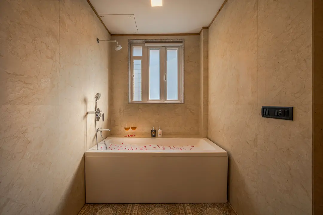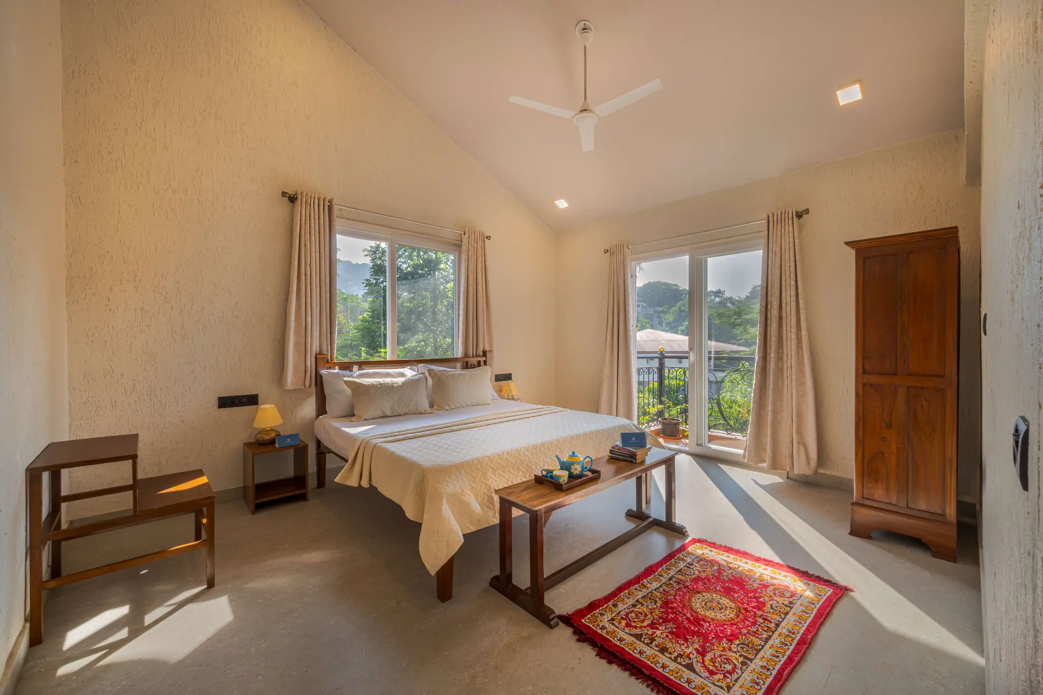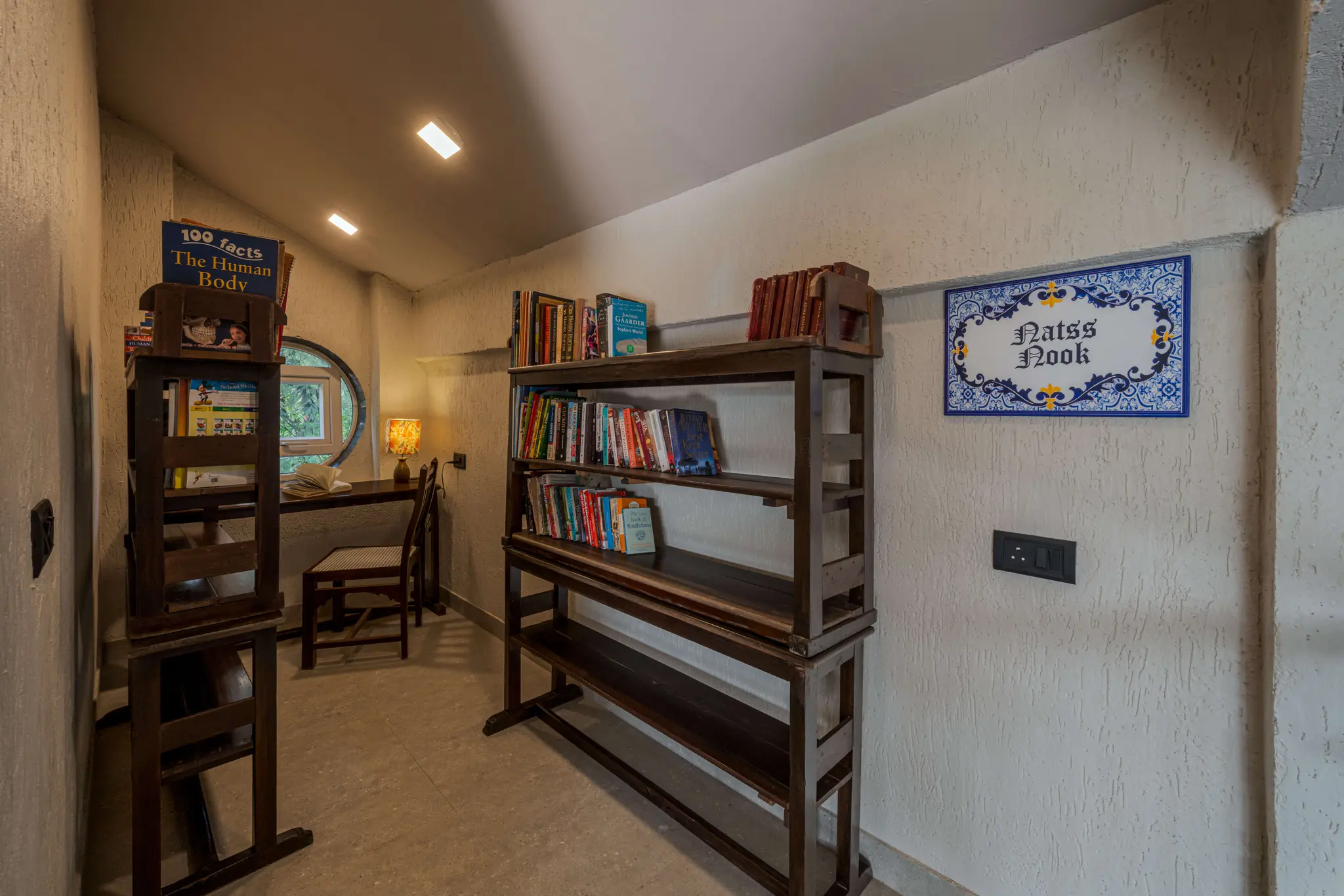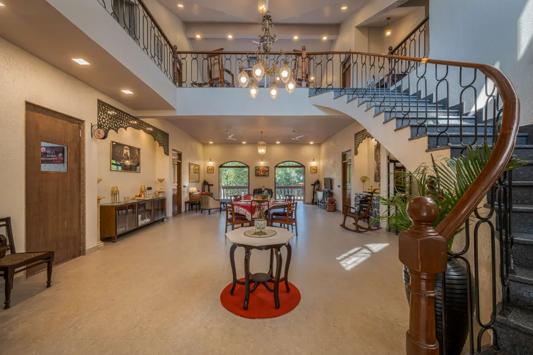 A holiday home that emanates colonial vibe, book this villa in Lonavala if you’re looking for something different on your weekend getaways. Ryewood Park Estate is a 5-bedroom home with a large pool, lush garden, a spacious verandah and lawns. Its all-white exteriors, bricked walls, and circular stairs leading from balcony to terrace create a striking impression that you’ll want to frame. The home is nicely designed with antiques and each piece adds to its overall timeless charm. Why Rent This 5BHK Colonial Villa in Lonavala 1) Striking architecture that makes you feel living back in the times 2) Spacious living areas with multiple seating arrangements 3) This is a villa with bathtub in Lonavala, as one of the ensuite bedrooms has a bathtub 4) A reading nook in the home with a collection of books, desk with reading lamps and a chair